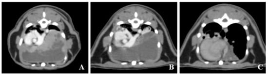 In dogs and cats, a thymoma is a common cranial mediastinal tumor; cystic thymomas seem to be the most common form in cats []. The metastatic rate has been found to be 20% in cats with cystic thymomas, and thus, a thymoma should be considered a malignant tumor []. Surgical excision is the most common treatment []; however, a higher disease stage is characterized by a larger tumor and invasion, adherence, or both to surrounding structures, making complete excision difficult to impossible. The potential for postoperative morbidity and mortality and recurrence of larger and invasive tumors is often high [,]. Therefore, a different treatment modality is needed for their management. These different treatment modalities include chemotherapy [] and RT [,,,,,,]. In veterinary and human medicine, the radiation dose used for thymoma typically ranges between 40 and 60 Gy [,,,,,,]. This report describes the computed tomographic findings following low-dose RT (16 Gy) using SQAP and easy surgical resection in a case of feline thymoma.