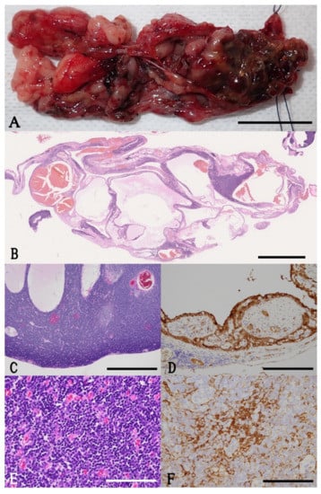 Photographs of the excised tumor. (A) Macroscopic view. The removed tumor consists of numerous, pale tan to dark red, variably sized cystic structures and scattered soft nodules. Bar = 2 cm. (B) Subgross whole slide image. The tumor is composed of fluid-or-blood-filled cysts and solid neoplastic tissue. Hematoxylin and eosin stain; bar = 3 mm. (C) Photomicrograph ×40. The neoplastic tissue shows medullary differentiation manifested by darker periphery and lighter center, resembling thymic cortex and medulla. Cystic spaces are also present. Hematoxylin and eosin stain; bar = 1 mm. (D) Photomicrograph ×200. The cysts within the lesion are lined by pleomorphic cells, which are positive for cytokeratin AE1/AE3. Immunohistochemistry; bar = 200 µm. (E) Photomicrograph ×400. The neoplastic tissue is composed of dense sheets of mature small lymphocytes (reactive component) with scattered, ovoid, stellate, or elongated cells (neoplastic component). Hematoxylin and eosin stain; bar = 100 µm. (F) Photomicrograph ×400. Neoplastic cells are positive for cytokeratin AE1/AE3. Immunohistochemistry; bar = 100 µm.