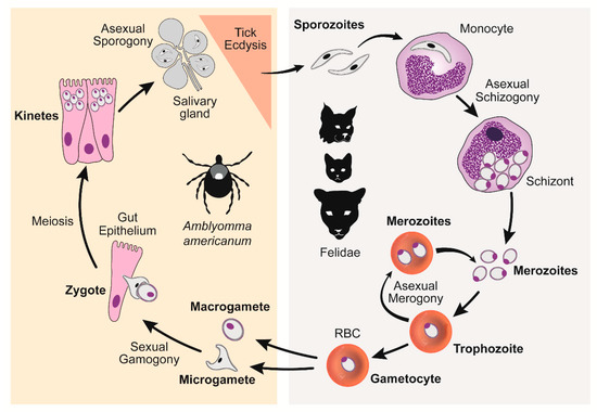 C. felis lifecycle. Right panel: C. felis reproduction within a felid host, asexual schizogony and merogony. Left panel: C. felis reproduction within a tick vector, sexual gamogony and asexual sporogony [10]. (Reproduced with permission from Yvonne Wikander, Pathogens; published by MDPI, 2020.).