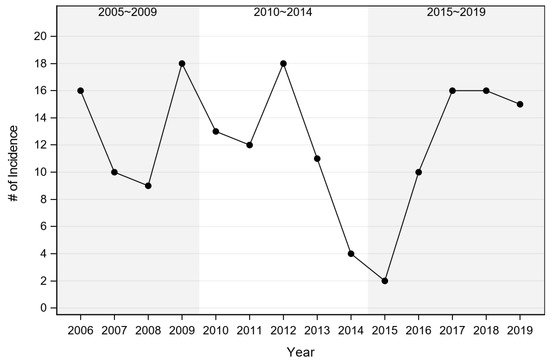 A total of 183 domestic cat records with a diagnosis of acute cytauxzoonosis from May 2006 through October 2019 were identified. Thirteen records were excluded from the study because they had no identifiable state of origin (n = 3) or they came from adjacent states (n = 10), leaving records from 170 domestic cats diagnosed with cytauxzoonosis from eastern Kansas available for analysis. These 170 records were evaluated to determine if the incidence of acute cytauxzoonosis cases was changing over time. Of those cases with a reported live-dead status (n = 140), only one cat survived. The greatest numbers of acute cytauxzoonosis cases were reported in 2006, 2009, 2012, 2017, 2018, and 2019 (Figure 2, Table S1). Because the number of cases varied from year-to-year, testing results were evaluated by year blocks: 2005–2009, 2010–2014, and 2015–2019. No significant difference was detected between any of the year blocks (p = 0.754) (Table 1, Table S2). Although acute cytauxzoonosis inter-annual variation was observed over time, collectively the incidence was stable over a broader time scale.