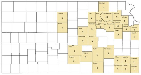 County-level locations of identified acute cytauxzoonosis cases in Kansas are presented in Figure 3. Acute cytauxzoonosis case samples were submitted to KSVDL from cats living in 31 eastern Kansas counties, with >50% of the samples coming from the county in which the KSVDL resides (Riley) and those immediately adjacent (Pottawatomie, Wabaunsee, Geary, Clay, Marshall). Statistical analysis of location data for acute cytauxzoonosis cases in specific counties was not possible because the sampling method across counties was not standardized.