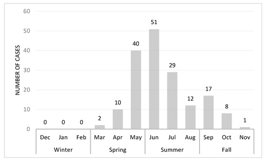 To examine the intra-annual acute cytauxzoonosis case incidence, the incidence of acute cytauxzoonosis cases diagnosed in different months and seasons was evaluated (Figure 4). A bimodal distribution of cases was observed, with the greatest case peak between May (n = 40) and June (n = 51) and a second smaller case peak in September (n = 21). Similarly, the greatest proportion of acute cases was observed in summer (54.1%), then spring (30.6%) and fall (15.3%). The seasonal distribution of acute cytauxzoonosis cases was significantly different from that of ill (C. felis-unrelated) control case incidence (p < 0.001) (Table 2, Figure S1). The seasons that contributed most to the significance (i.e., large Pearson chi-square statistic) are fall with 15.3% for the acute cytauxzoonosis cases vs. 38.2% for the ill control cases, as well as winter with 0% for the acute cytauxzoonosis cases vs. 7.3% for the ill control cases.