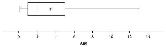 To examine if a correlation exists between specific cat risk factors with acute cytauxzoonosis case incidence, cat age, sex, and lifestyle were investigated. Feline age was reported in 156/170 cases evaluated, with the greatest number of acute cytauxzoonosis cases observed in cats 1–3 years old (40.4%) and with fewer cases observed in ≥5 years old (25.6%), 3–5 years old (21.8%), and <1 year old (12.2%) age groups (Table 3, Figure S2). The mean age of cats diagnosed with acute cytauxzoonosis was 3.4 years (range 1.4 months to 13 years) (Figure 5). The age distribution of acute cytauxzoonosis cases was significantly different from that of ill control case incidence (p < 0.001). The age group that contributed most to the significance (i.e., large Pearson chi-square statistic) is <1 year old with 12.2% for the acute cytauxzoonosis cases vs. 47.0% for the ill control cases.