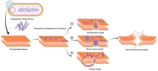 Depending on the nature of AMPs, the targets can be Gram-positive or G negative bacteria, fungi, or viruses [,,,,]. The propensity to bind membranes is a conclusive feature of AMPs, which may or may not be associated with membrane permeabilization []. These AMPs employ several mechanisms to wipe out pathogens; most of them rely on the disruption of the cell membrane or alteration in cell membrane permeability, which ultimately relies on various physicochemical parameters possessed by the sequence. While most of the AMPs mainly adopt this approach for killing, others interfere with intracellular functions like DNA and protein synthesis, protein folding, or cell wall synthesis. Physicochemical parameters such as assize, charge, hydrophobicity, and amino acid composition directly affect the ability of the AMPs to insert in the membrane and induce pore formation. The slightest tweak in these parameters might augment the activity of AMPs. These properties facilitate amphipathic α-helix peptides to disrupt bacterial cell membranes by different models, namely, the barrel stave, carpet, and toroidal pore model (Figure 1). In the barrel stave model, peptides interact with one another to form a channel-like structure, while in the toroidal pore model, such peptide-peptide interaction is lacking; toroid pores are rather formed by peptides in a cooperative manner. In the carpet model, instead of forming pores peptides spread across the membrane in parallel orientation disordering the structure, at higher concentrations, these peptides act as a detergent, causing micellization of the phospholipid bilayer.