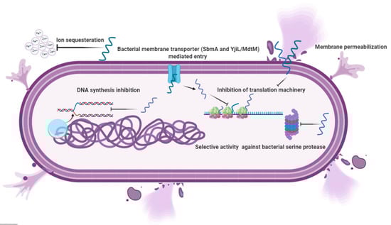 The fundamental basis for antimicrobial action is the difference between bacterial and mammalian cell composition. The outer leaflets of bacterial membranes are populated mainly by negatively charged phospholipids, whereas mammalian cells are mostly composed of neutral zwitterionic phospholipids, such as phosphatidylcholine and sphingomyelin []. The Shai-Matsuzaki-Huang model describes the interaction of α-helical AMPs targeting bacterial membranes. It shows the stepwise accumulation of AMPs followed by either integration into the membrane resulting in membrane disruption or diffusion from membrane onto intracellular targets [,,]. These intracellular targets are components of vital processes such as replication and translation and enzymes for sustenance (Figure 2). PR 39, a porcine AMP, exerts its lethal effect by halting the process of translation and DNA synthesis []. Similarly, Indolicidin exerts its antimicrobial activity by halting DNA synthesis [,]. Marchand and co-workers reported that it inhibits DNA synthesis as well as topoisomerase I, thus employing multiple mechanisms at the DNA level for its antimicrobial activity. It exerts antimicrobial activity in gram-negative bacteria by disrupting the cytoplasmic membrane by forming channels and membrane thinning [,]. A similar mechanism for the peptide was reported for a pathogenic fungus Trichosporon beigelii []. Nevertheless, a different study suggested that even though the peptide caused permeabilization of the bacterial membrane, it was inefficient in lysing bacterial cells [].