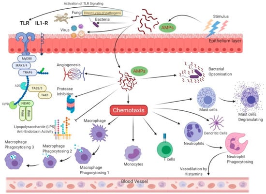 It is remarkable that unlike antibiotics, many AMPs are more bactericidal than being bacteriostatic []. There are several unique features in the sequence of AMPs, such as net charge, hydrophobicity, secondary structure, etc., which stimulates additional anti-infective support in the host to fight against infection (Figure 3). In addition to having a direct effect on the target organism, AMPs can also act as a potent immunomodulator (Figure 4). They act as effector molecules of the innate immune system and influence diverse processes such as phagocytosis, cytokine release, and cell apoptosis [,]. They also act as a chemotactic factor, assisting in recruitment and aggregation of immune cells at the site of inflammation [,], promoting angiogenesis [,], and inducing wound healing [] by cytokine release and cell proliferation [,].