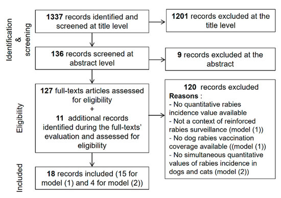 Literature search and records’ selection process to fit dog and cat rabies incidence prediction models in enzootic dog rabies areas. Model (1) and model (2) correspond to the annual dog rabies incidence and annual cat rabies incidence predictions models respectively.