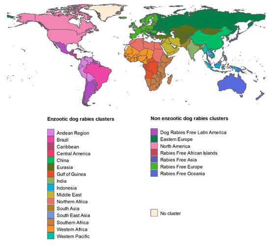 Annual dog rabies incidence was predicted using model (1) and dog vaccination coverage data from Hampson et al. in 2015 [1] provided for country or cluster of countries and obtained by expert elicitations. A “cluster” refers to countries grouped together due to their proximity, similar socioeconomic status and epidemiological rabies situation as previously described [1], adapted to factor in recent data and expert opinions. The 23 clusters (of which 16 are EDRAs) used here are presented in Figure 2. Annual cat rabies incidence was then predicted using dog rabies incidence predictions and model (2) both at country and cluster levels.