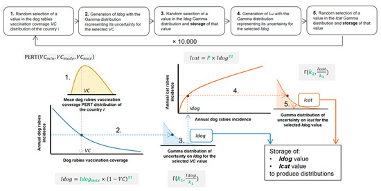 Uncertainty about the incidence predictions (i.e., distributions of and ) was assessed for each cluster with the following iterative process which is also summarised in Figure 3: (1) Random selection of the dog rabies vaccination coverage using a PERT distribution (defined using minimum, modal and maximum values provided in [1]) for the chosen cluster; (2) Determination of the Gamma distribution parameters for dog rabies incidence using the selected level of vaccination coverage. The shape parameter was provided by the fitted model (1) and the scale parameter by the value of (considered as the distribution mean) divided by the shape parameter; (3) Random selection and storage of a value in the generated annual dog rabies incidence distribution; (4) Determination of the Gamma distribution parameters for cat rabies incidence through the same process as in (2) using the selected level of annual dog rabies incidence but using model (2); (5) Random selection and storage of a value in the generated annual cat rabies incidence distribution. This iterative process was repeated 10,000 times.