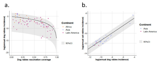 In EDRAs, we assumed that the annual incidence of cat rabies depends on the annual incidence of dog rabies, since dogs act as the primary reservoir [23,24,25]. Similarly to the annual dog rabies incidence model and according to the observed linear relationship between log-transformed raw data on annual dog and cat rabies incidences, we defined the functional relationship between cat and dog rabies incidences, and respectively, as follows: