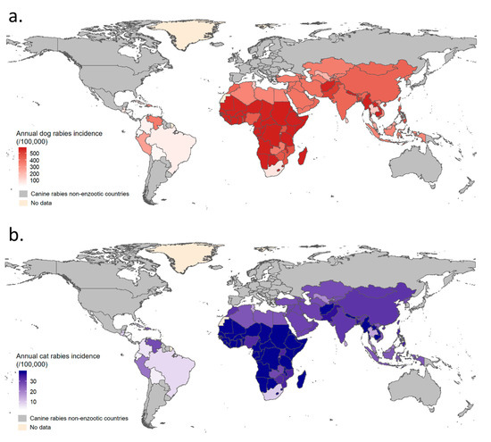 Mean predicted annual dog and cat rabies incidences by country in enzootic dog rabies areas. Map (a) for mean annual dog rabies incidence was produced using model (1) and map (b) for mean annual cat rabies incidence was produced using model (2). If dog rabies vaccination coverage was not available for a specific country, a global cluster estimate was used to predict canine rabies incidence.