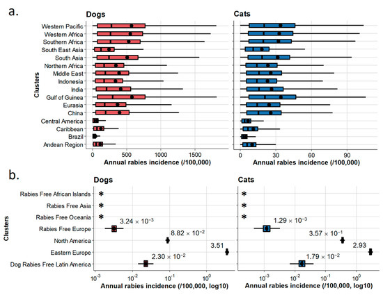 Annual dog and cat rabies incidences by cluster of countries. Annual incidence in enzootic dog rabies areas (a) and in non-enzootic dog rabies areas (b). Boxes represent the interquartile range (IQR); vertical bars represent the median; upper whiskers extend to the 75th percentile and the highest value that is within the 75th percentile + 1.5 × IQR; lower whiskers extend to the 25th percentile and the lowest value that is within the 25th percentile − 1.5 × IQR. Dots represent the mean annual incidence of the clusters (completed with mean values in (b)). *: no reported cases.