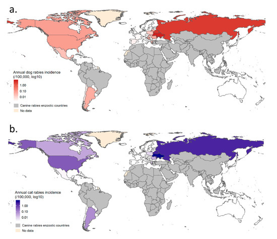 Mean annual dog and cat rabies incidences by country in non-enzootic dog rabies areas. Map (a) presents mean annual dog rabies and map (b) presents mean annual cat rabies incidence.