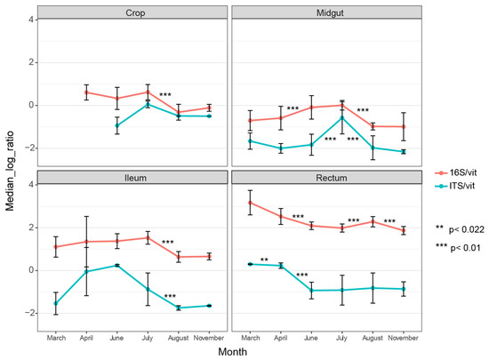 qPCR results showing median relative abundance of bacteria (16S) and fungi (ITS1) across months per gut part. Both 16S and ITS1 gene DNA are normalized against vitellogenin gene DNA. The vitellogenin gene copies were used as a proxy for the weight of the tissue. Error bars represent standard deviations. The asterisks represent statistical significance using the Wilcoxon signed-rank test.