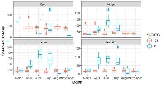 Observed species for bacteria (16S) and fungi (ITS) shown across months for different gut part. The missing data in the figure are due to lack of information for those datapoints. This particularly relates to fungi in crop, as the levels were very low.