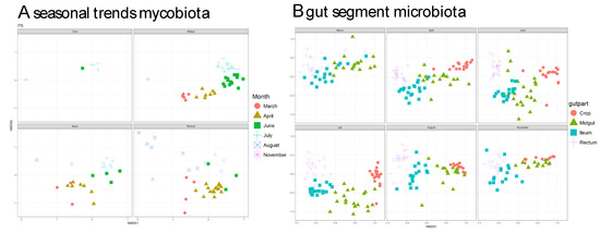 NMDS plots revealed that the fungal community is highly influenced by season as the different fungal communities each month cluster apart, i.e., fungal communities were not much different between gut parts and the different gut part communities were similar in regard to different months (Figure 3A). This contrasts with the bacterial communities, which clustered by gut parts, i.e., bacterial communities showed highly gut part-specific communities, which were not strongly influenced by season (Figure 3B).