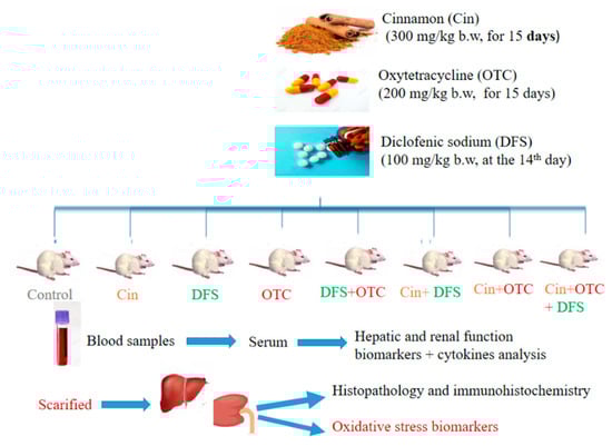 Sixty-four adult male albino rats weighing between 130–160 g were obtained from the laboratory animal unit of Zagazig University. During 14 days of acclimatization, the animals were fed normal control diet and water ad libitum. The protocol of this experiment was accepted by the Animal Ethical Committee of the Faculty of Veterinary Medicine, Mansoura University, Egypt (approval no. R/2). The animals were randomly divided into the following eight experimental groups (n = 8); the control group; received physiological saline daily. Cin groups; treated daily with Cin aqueous extract at a dose of 300 mg/kg b.w. for 15 days []. DFS group; received a single dose of DFS at 14th day (100 mg/kg b.w.) []. OTC group; rats received 200 mg/kg b.w./day of OTC for 15 days []. DFS + OTC group; received OTC for 15 days and a single oral dose of DFS at 14th day with the same previous doses. Cin + DFS group; rats received cinnamon extract for 15 days and treated with diclofenac sodium at the 14th day. Cin + OTC group; treated with cinnamon extract and 30 min later the rats received OTC for 15 days. Cin + DFS + OTC group; treated with a combination of Cin extract, DFS and OTC, at the same previous manner and doses. All rats were treated orally according to their group using a stomach tube.