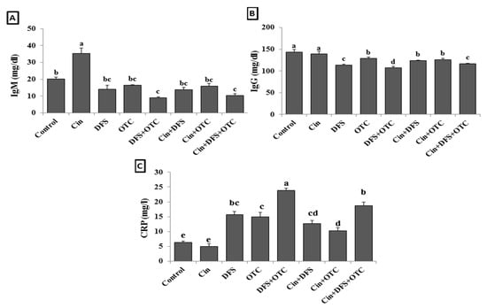 IgM (A), IgG (B), and CRP (C) levels of male albino rats treated orally with cinnamon aqueous extract (Cin, 300 mg/kg b.w./day), single dose of diclofenic sodium (DFS, 100 mg/kg b.w.) and oxytetracycline (OTC, 200 mg/kg b.w./day). Data are expressed as the mean ± SEM (n = 8). Each bar carrying different letters (a, b, c, d, e) is significantly different (p < 0.05).