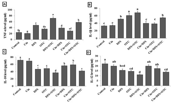 The elevation of serum TNF-α and IL-1β levels reflect the hepato-renal injury as showed in DFS + OTC, OTC, and DFS groups (p < 0.05) (Figure 3B,C). While the treatment of intoxicated rats with Cin showed significantly reduced TNF-α level in DFS + OTC and DFS groups and IL-1β level in DFS + OTC, OTC, and DFS groups (p < 0.05) (Figure 2A,B). The serum levels of IL-10 and IL-12 were significantly reduced in DFS + OTC, OTC, and DFS groups when compared with the control one (Figure 3C,D) (p < 0.05). The rats that received Cin showed significant elevation in the IL-10 level (p < 0.05) (Figure 3C).