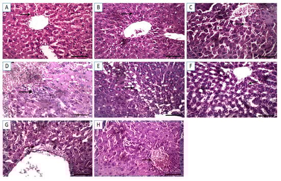 The hepatic tissue sections from control and Cin treated rats showed normal hepatocytes with normal radial arrangement around the central vein (Figure 4A,B). In contrast, hepatic sections from DFS treated rats displayed necrosis of the hepatocytes with dilatation of the hepatic sinusoids (Figure 4C). Similarly, tissue sections from OTC-treated rats exhibited histopathological alterations, in which massive hemorrhage replacing hepatic parenchyma and round cells infiltration were observed (Figure 4D). Additionally, the histological liver sections of rats treated with both DFS and OTC revealed vacuolation and necrosis of the hepatocytes (Figure 4E). Remarkable amelioration of histopathological changes was noted in the DFS + Cin treated group compared to DFS treated group (Figure 4F). Moreover, histological investigation of group VII (OTC + Cin treated rats) presented nearly normal hepatocytes with mild perivascular edema (Figure 4G). Meanwhile, in the liver of DFS + OTC + Cin treated group, hemorrhage replacing hepatic parenchyma was noted (Figure 4H).
