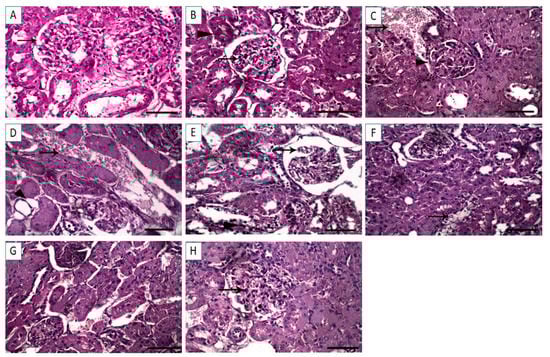 Light photomicrographs of renal tissues (sections stained with H &E). (A,B) control and cinnamon groups: Normal renal glomeruli and normal renal tubules. (C) DFS group: revealed proliferation of the renal glomeruli and marked hemorrhage in interstitial tissue displacing renal parenchyma (D) OTC group: Showing hemorrhage in interstitial tissue displacing renal parenchyma. (E) DFS + OTC group: Congestion in the renal glomeruli and necrosis in the renal tubular epithelium were observed. (F) DFS + Cin group: Degenerative changes in the renal tubular epithelium. (G) OTC + Cin group: Fairly normal histological structure, and (H) DFS + OTC + Cin group: Revealing mild proliferation of the renal glomeruli and normal renal tubule. Scale bar = 100 µm.
