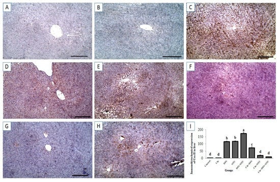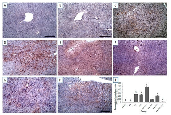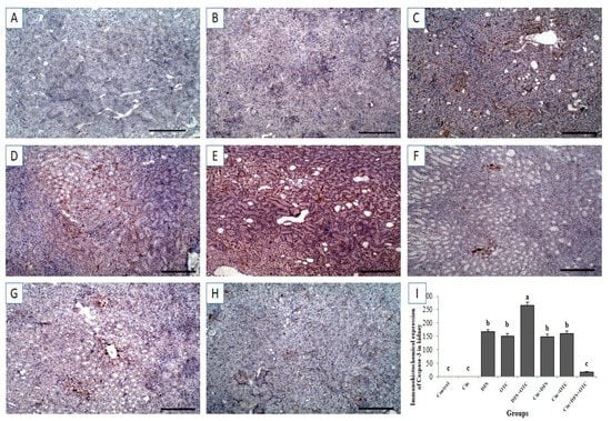 Immunohistochemical staining of rat liver by caspase-3. (A,B) control and cinnamon groups: Showing negative caspase-3 reaction in the liver sections. (C,D) DFS and OTC groups: Revealing strong positive caspase-3 reaction in the hepatocytes. (E) DFS + OTC group: Showing higher expression levels of caspase-3 relative to those in rats treated with DFS or OTC alone (F) DFS+ Cin group: Revealing weak caspase-3 reaction. (G) OTC + Cin group: strong caspase-3 positive reaction. (H) DFS + OTC + Cin group: Showing reduction in caspase-3 reaction compared to DFS + OTC group. (I) Quantification of caspase-3 in the liver tissues in different groups. Data are presented as the mean ± SEM (n = 5), analyzed using one way ANOVA and each bar carrying different letters (a, b, c, d) is significantly different (p < 0.05). Scale bar = 100 µm.