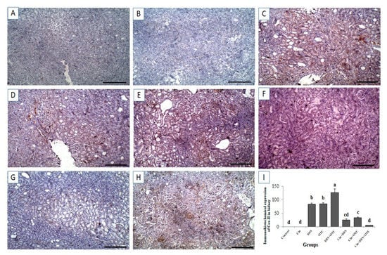 Immunohistochemistry exhibited negative caspase-3 and Cox-II immunostaining reaction in the renal tissues of control and Cin treated rats (Figure 8A,B, respectively, for caspase-3 and Figure 9A,B, respectively, for Cox-II). On the other hand, strong positive caspase-3 and Cox-II immune staining were recorded in the DFS and OTC treated groups (Figure 8C,D, respectively, for caspase-3 and Figure 9C,D, respectively, for Cox-II). Additionally, DFS + OTC treated group showed higher expression levels of caspase-3 and Cox-II compared to those in the group treated with DFS or OTC individually (Figure 8E and Figure 9E). On the contrary, reduction in immune reactivity of caspase-3 and Cox-II was observed in DFS + Cin treated rats (Figure 7F and Figure 8F, respectively) and in the OTC +Cin treated group (Figure 8G and Figure 9G, respectively). Moreover, DFS + OTC + Cin treated group displayed moderate positive caspase-3 and Cox-II immune staining (Figure 8H and Figure 9H, respectively).