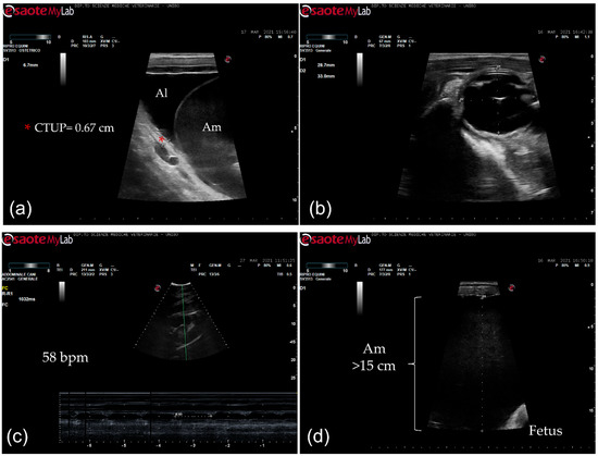 Ultrasonographic images. (a) Transrectal ultrasonographic examination of the combined thickness of the uterus and placenta (CTUP) (red asterisk); Al: allantoic fluid; Am: amniotic fluid; (b) fetal orbit measurement (transrectal ultrasonography); (c) fetal heart rate measurement (58 bpm) (transabdominal ultrasonography); (d) depth of the amniotic fluid (>15 cm) (transabdominal ultrasonography); Am: amniotic fluid.