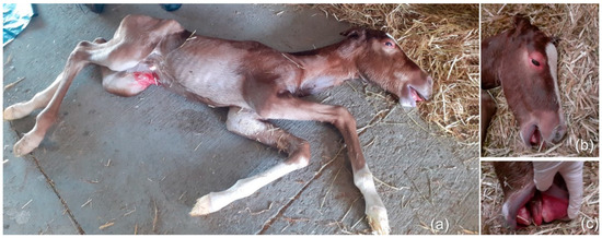 At 327 days of gestation, the mare gave birth to a non-viable male foal (Figure 2a). The foaling took place in broad daylight, and it lasted about 20 min. The foal was born at 3:20 pm still wrapped inside the amniotic membrane, which required a certain force to be broken. The APGAR score at birth was 1: heart rate was 40 bpm; mucous membranes were congested/cyanotic (Figure 2c); the foal was unresponsive to stimulation, in lateral recumbency, and spontaneous respiration did not commence. The resuscitation attempt was unsuccessful, and the foal died immediately. The head was edematous, particularly at the level of the lips and eyelids (Figure 2b).