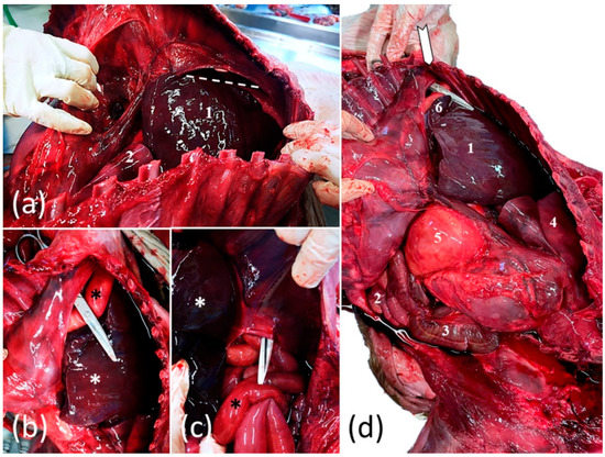 Foal’s congenital pleuroperitoneal diaphragmatic hernia: (a) cranial view of the thoracic cavity after removal of the left thoracic wall; the thoracically translocated parts of the liver (1), the diaphragm and the area of the dorsal diaphragmatic defect (dotted accolade) and hypoplastic left lung (2); (b,c) caudal view of the large diaphragmatic defect with round and bold margins (indicated by surgical scissors) which allowed partial migration of the liver (white *) and bowel (black *) from the abdomen into the thorax; (d) lateral view of the coelomic cavity after removal of the thoracic wall; the thoracically translocated parts of the liver (1); the ventral (2) and the dorsal (3) loop of the left ascending colon; the diaphragm and the area of the dorsal diaphragmatic defect (white arrow); the lung (4) the stomach (5) and the spleen (6).