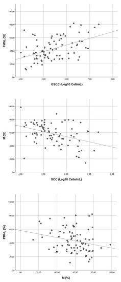 Scatter plots displaying the relationship between. different variables. PMNL vs. QSCC, r = 0.477–p < 0.0001; M vs. QSCC, r = −0.388–p < 0.0001; and M vs. PMNL r = −0.247–p = 0.027. Legend: PMNL = polymorphonucleates; % = percentage; QSCC = quantitative somatic cell count; Log = logarithm; mL = milliliters; M = macrophages.
