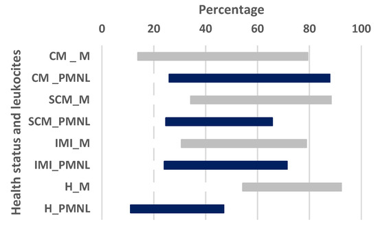 Gantt graph displaying the range values of macrophages and polymorphonuclear leukocytes milk-secreted by dairy buffalo with different udder health status. Legend: CM = clinical mastitis; SCM = subclinical mastitis; IMI = intramammary infection; H = healthy; M = macrophages; PMNL = macrophages and polymorphonuclear leukocytes.