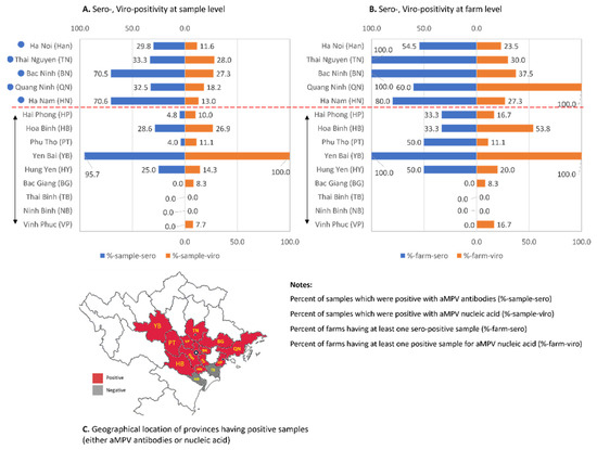 Summary of serology and virology tests for aMPV specific antibodies and nucleic acid. The detection result at the sample level (A) and farm level (B). The attached map (C) shows the geographical locations of the provinces that have positive samples. The double-headed arrow indicates the provinces that have fewer than five investigated farms.