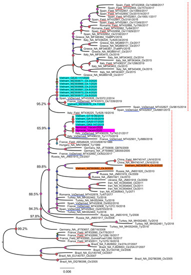 To date, the majority of aMPV sequences deposited in GenBank are partial sequences (3′ or 5′ end) of the G gene. To classify Vietnamese aMPVs to the previous known field-, vaccine-, and vaccine-derived aMPV strains [35], the phylogenetic tree was first reconstructed based on the partial G gene (nucleotides 67–366) (Figure 4). Based on the branching pattern, at least two genetic clades of an aMPV subgroup B were observed: the clade that contained only field strains (near the root of the phylogenetic tree) and the mixed clade that consisted of field strains, vaccine strains, and vaccine-derived strains (dashed red lines, Figure 4). Accordingly, 14/14 Vietnamese aMPV strains were classified as vaccine-derived strains.