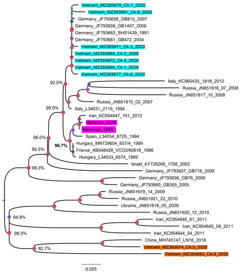Since the most variable genomic region of the G gene was from the 460th nucleotide, a phylogenetic tree based on the nearly complete G gene was reconstructed for a more precise classification. For this analysis, five Vietnamese aMPVs were excluded due to the partial G gene. As shown in Figure 5, nine strains of Vietnamese aMPVs are clearly separated from the branch containing the vaccine strains. In addition, based on the distant relationship between the nine Vietnamese aMPV strains on the phylogenetic tree, it was suggested that there were at least two genetic groups of aMPV circulating in northern Vietnam. Group 1 (Ck.1–Ck.4 and Ck. 6–Ck.8) was closely related to aMPVs in Europe (Germany, Italy, and Russia), while group 2 (Ck.5 and Ck.9) was related to aMPV circulating in Asia (Iran and China).