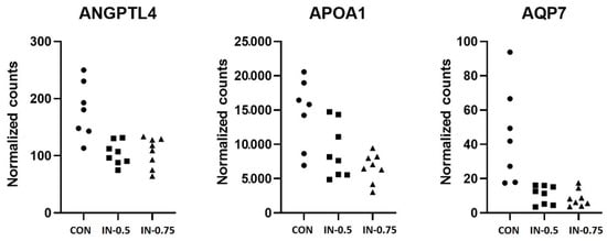 A total of 18,170 transcripts could be mapped to the Sus scrofa reference of Ensembl. Of these genes, only three were differentially expressed between the CON group and the IN-0.5 group. All of them were downregulated in the IN-0.5 group (Table 2). When comparing the CON group with IN-0.75 group, eight genes were differentially expressed. Five of them were downregulated in the IN-0.75 group, including the three genes seen earlier as differentially expressed between CON and IN-0.5. Three genes were upregulated in the IN-0.75 group compared to the CON group (Table 2). No genes were found to be differential expressed between IN-0.5 and IN-0.75. We validated three genes, Angiopoietin-like protein 4 (ANGTPL4), Apoliprotein A1 (APOA1), and Aquaporin 7 (AQP7), using qPCR. Their expression was measured relatively to the geometrical mean of the expression of two housekeeping genes, ACTB and GAPDH.