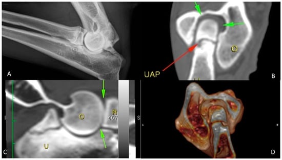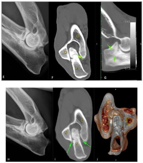 - Lenehan, T.M.; Van Sickle, D.C. Ununited Anconeal Process, Ununited Coroneal Process, Ununited Medial Epicondyle, Patella Cubiti and Sesamoidale Fragments of the Elbow; JB Lippincott Company: Philadelphia, PA, USA, 1985. [Google Scholar]