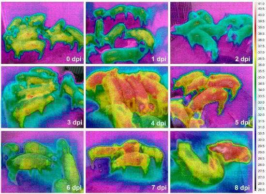 The time-series TIR images of ASFV-infected pigs were analyzed using Fluke Connect SmartView Software (Fluke Corp.) to deduce the maximum surface temperature of the selected areas. The software was set to treat each image in the color palette according to the skin temperature in the range of 26–41 °C, with an emissivity of 0.98. The maximum skin temperature was recorded and analyzed every day from the TIR image of the herd as well as the TIR images (from three ROI) of individual pigs.