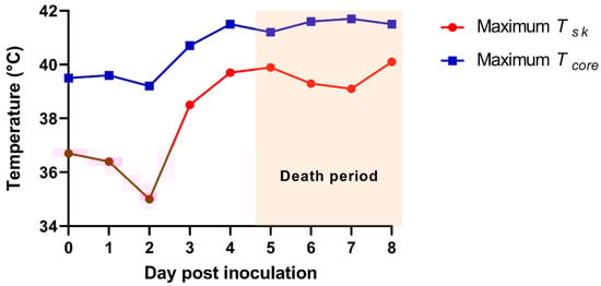 The maximum skin infrared temperature (Tsk) from the thermal infrared images of the African-swine-fever-virus-infected herd (red line). The maximum rectal temperature (Tcore) of the pig from the African-swine-fever-virus-infected herd (blue line).