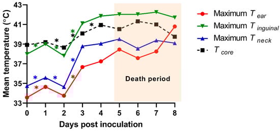 Mean of the maximum infrared skin temperatures of the three regions of interest [the ear (Tear), inguinal (Tinguinal), and neck (Tneck) region] and the mean of rectal temperature (Tcore) from experimentally ASF-infected pigs. * p < 0.05.