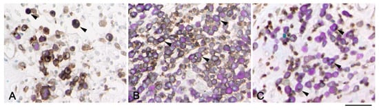 - Ramos-Vara, J.A.; Miller, M.A.; Valli, V.E.O. Immunohistochemical Detection of Multiple Myeloma 1/Interferon Regulatory Factor 4 (MUM1/IRF-4) in Canine Plasmacytoma: Comparison with CD79a and CD20. Vet. Pathol. 2007, 44, 875–884. [Google Scholar] [CrossRef]