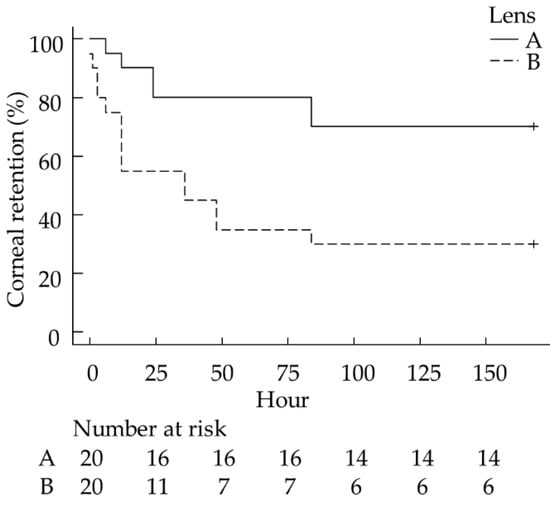 - Diehl, K.A.; Bowden, A.C.; Knudsen, D. Bandage contact lens retention in dogs—A pilot study. Vet. Ophthalmol. 2019, 22, 584–590. [Google Scholar] [CrossRef]