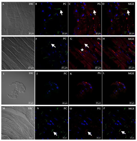 Representative immunofluorescent images showing PC and PG cellular localization from EMB sections of four different dogs. Panels (A–D) represent non-ARVC cardiac disease in a Dogue de Bordeaux (Dog #25) diagnosed with viral myocarditis. Note the longitudinal orientation of fibers (A), and positive immunofluorescent signal for PC at the area representing the ID (B). Immunofluorescent signal for PG (C) is also localized to the area of the ID and merges with PC signal (D). Panels (E–H) represent advanced (clinical) ARVC in an English bulldog (Dog #43). Note that while PC remains localized to the area of the ID (arrow, (F)), a complete absence of PG is noted in this area (arrow, (G)). Instead, PG is localized in a perinuclear pattern (star) and does not colocalize with PC (H). Panels (I–L) represent a non-diagnostic sample from a Great Dane (Dog #17) with tachycardia-induced cardiomyopathy. Panel I reveals the small number and imperfect orientation of cells, and lack of obvious cardiomyocytes, as evidenced in the non-diagnostic samples. Absence of PC signal was criteria for non-diagnostic sample (J). Panels (M–P) show representative images from a non-clinical boxer (Dog #44) with moderate ventricular ectopic load. Merged (MGE, (D,H,L,P)) shows colocalization, when present, of PC with PG (arrows). Images were obtained at 63× magnification.