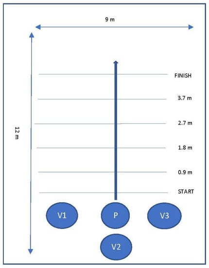 Diagram of layout used for data collection under each condition. Participant (P) was positioned behind the start line, to ensure they were in full stride by the time they hit the first joint angle measurement line (0.9 m). Participants were instructed to continue walking until they passed the finish line, to ensure that their kinematics were not impacted artificially by coming to a stop before the final joint measurement line (3.7 m). Researchers with iPhones (V1, V2, V3) were positioned to the left, right, and immediately behind the participant, and moved at the same speed as the participant throughout each condition.