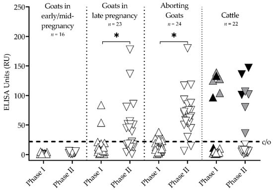 IgG antibody response against Coxiella burnetii of three goat groups with different reproductive status and cattle measured by two phase-specific ELISAs (Phase I △ and Phase II ▽). * Phase II ELISA detected more positive goats than Phase I (p < 0.05); c/o = ELISA cut-offs; colored points represent individual cattle: black = cows with IgG Phase II dominance, gray = cows with IgG Phase I dominance.
