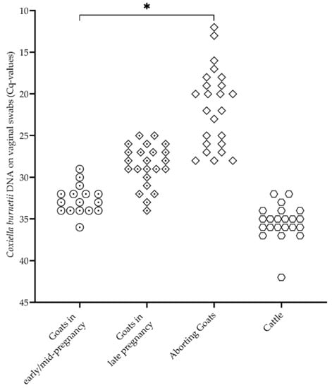 All vaginal swabs from the goats and cattle tested positive for C. burnetii DNA (Figure 2). The amount of pathogen on the vaginal swabs detected by the semiquantitative qPCR differed between the three goat groups (p < 0.05). Furthermore, the placenta from an aborting goat revealed a Cq-value of nine, and the placenta from a heifer also tested C. burnetii positive (Cq 20).