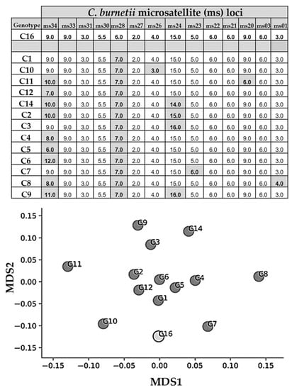 Result-table (top) from the CoxBase-MLVA-query when entering the genotyping profile from this study. For the first time, C16 was identified in bovine and caprine samples, and the next related MLVA-genotypes are C1, C7, and C10. Findings of the performed MLVA/VNTR analyses are depicted for different microsatellites’ (ms) loci (ms34, 33, 31, 30, 28, 27, 26, 24, 23, 22, 21, 20, 03, and 01). Loci from other known Coxiella genotypes, which do not match with the loci of the genotype C16, have a gray background. The multi-dimensional scaling (MDS) plot on the bottom created with Python depicts Jaccard similarity coefficients of the performed microsatellites analysis of the different Coxiella burnetii genotypes.