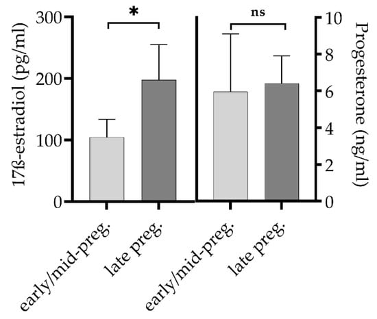 17ß-estradiol (mean, 95% confidence interval) and progesterone (median, 95% confidence interval) levels of goats in early/mid-pregnancy (n = 16) and in late pregnancy (n = 23). Difference of 17ß-estradiol levels between both groups is significant (* p = 0.01). ns = not significant.