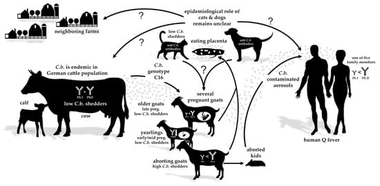 The present study describes an acute Q fever outbreak on a mixed dairy goat and cattle farm involving different animal species and the farmer’s family (Figure 5). Generally, C. burnetii circulation within a farm is poorly understood []. Therefore, serological and molecular investigations, including of all susceptible farm animal species and humans, are essential for understanding the dynamics of Q fever outbreaks and are in line with the One Health concept.
