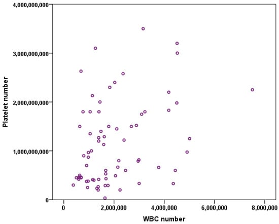 Pearson’s test showed that there is a strong positive correlation between the platelet number and the WBC number (p = 0.02, r = 0.357) (Figure 1).